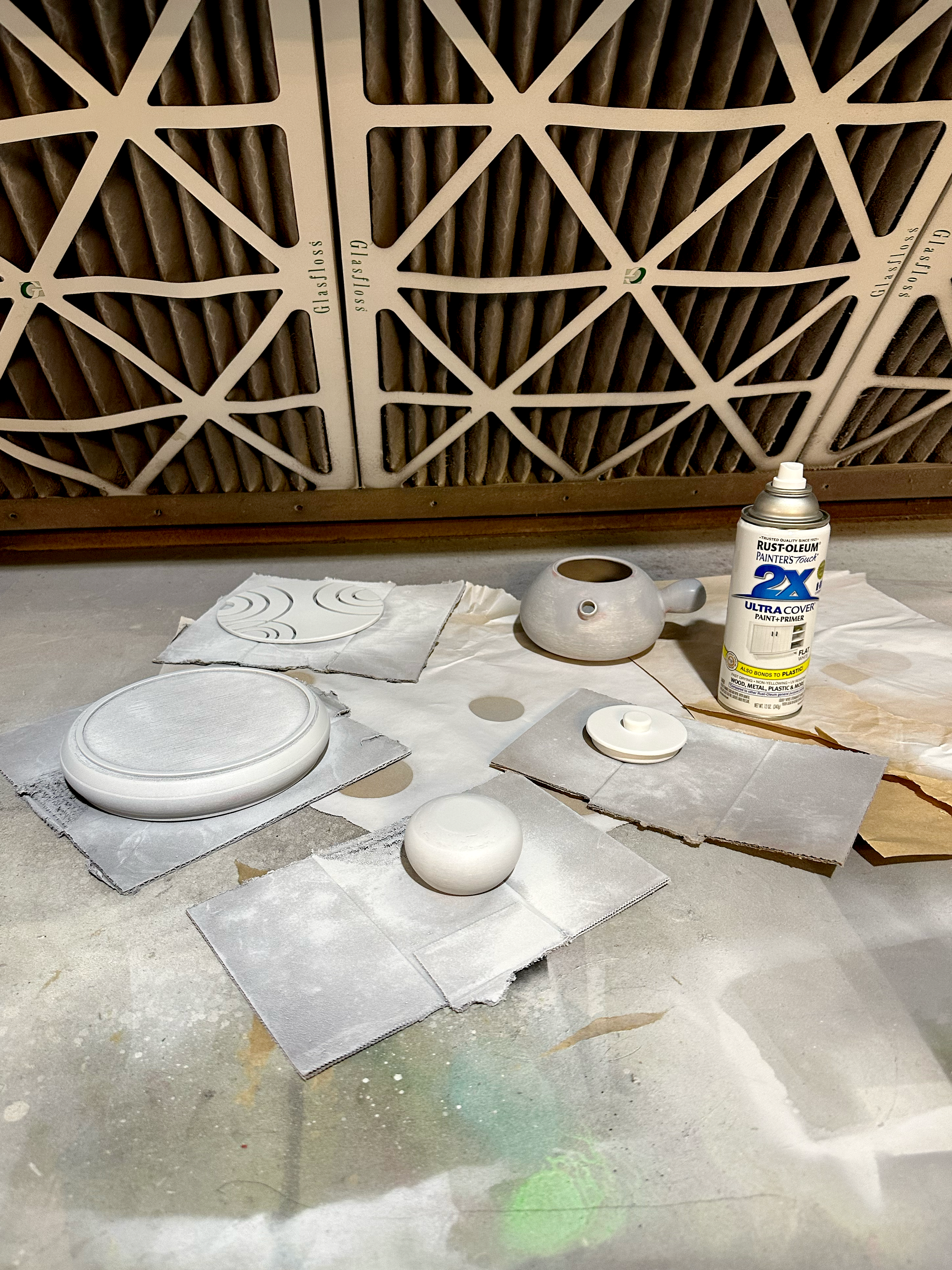 After 3D printing models, sanded and primed them. Following the initial layer of primer, sanded the pieces again to prep the surface for filling. Used automotive putty to fill the gaps. Repeated the process a few times, then coated the tea set parts with white paint.