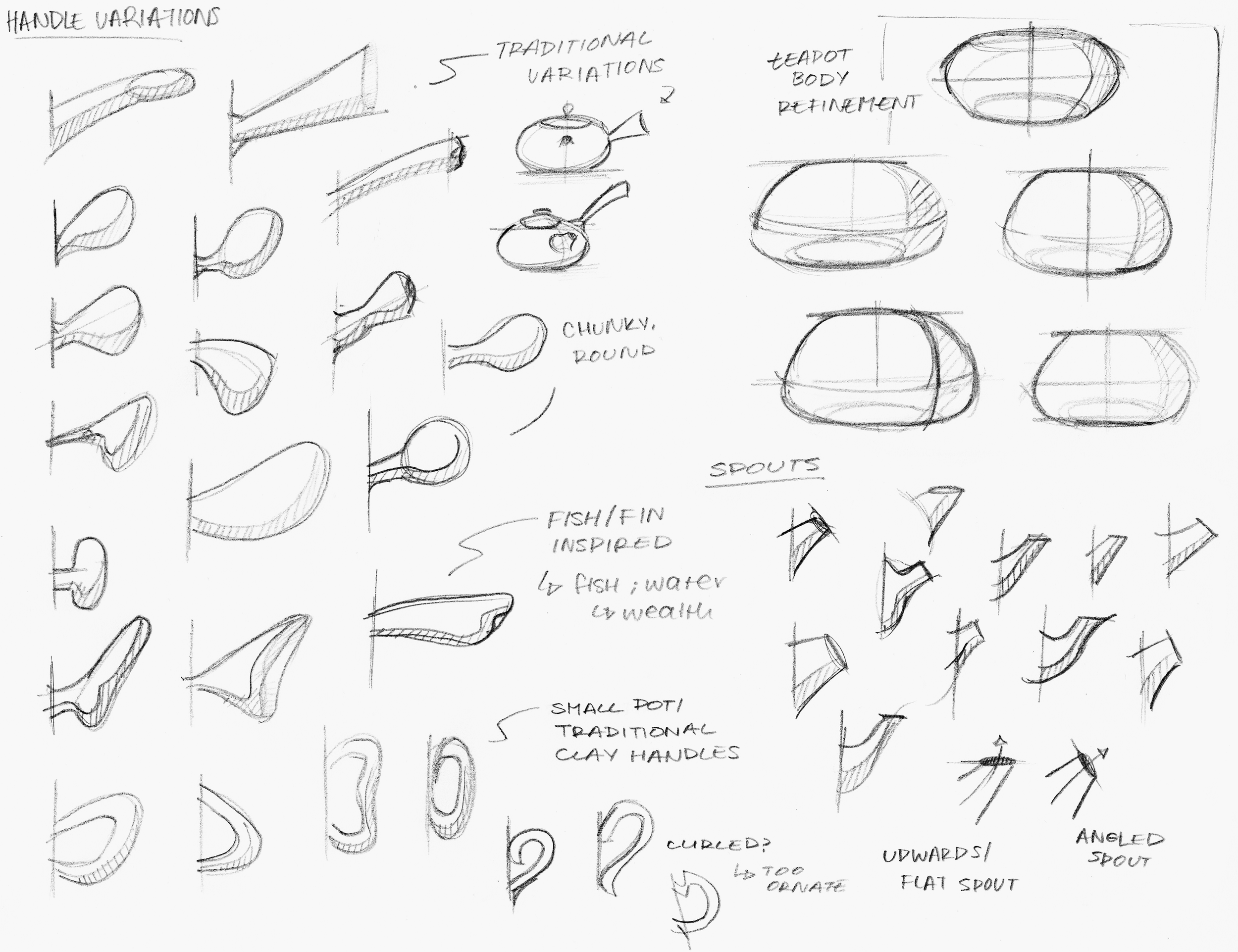 I played with different parts of the teapot below. One major change was the teapot body shape; the updated body is rounder, softer, and stouter. I wanted to emphasize playfulness and youthfulness.