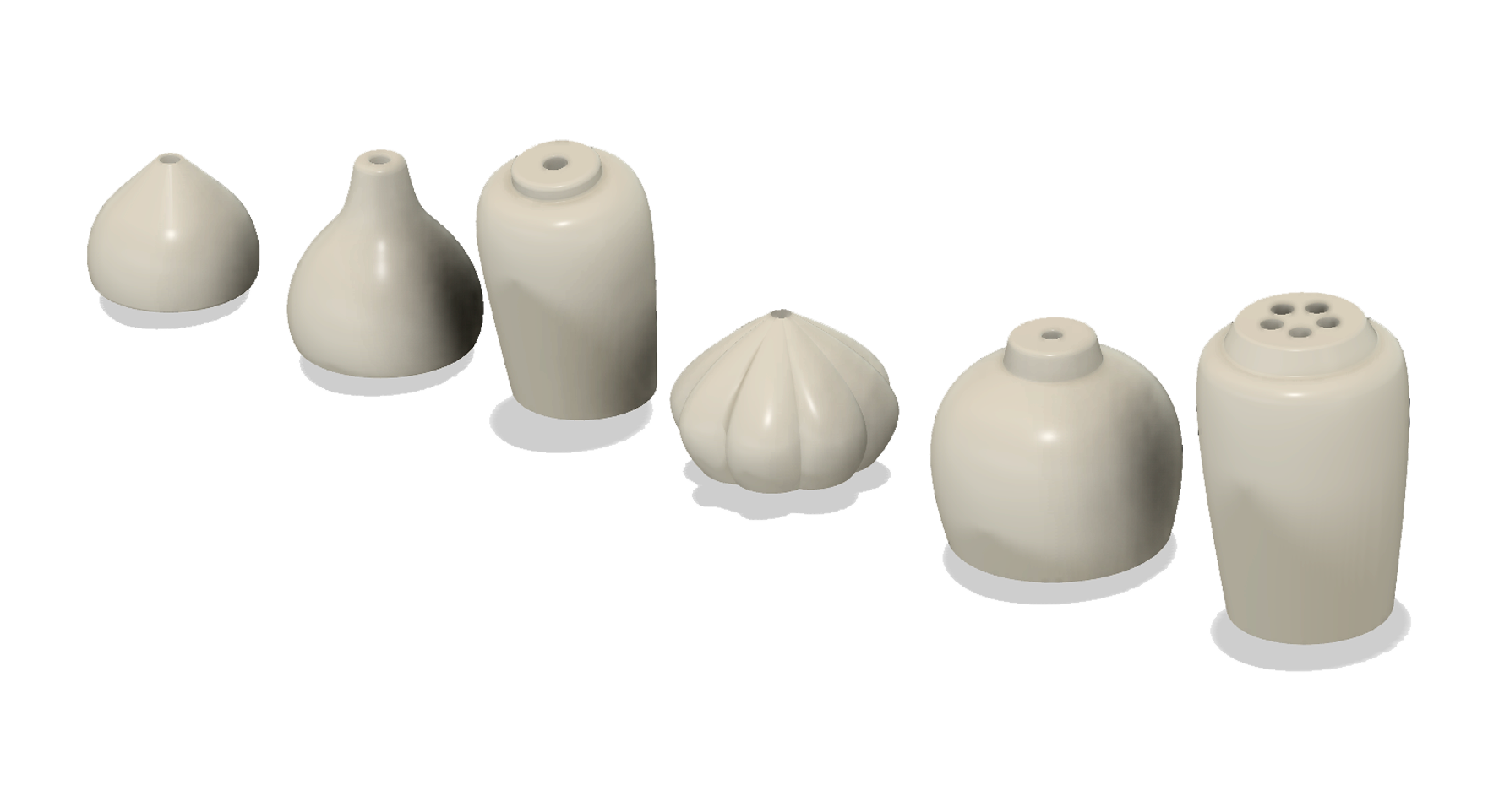Small scale 3D prints modeled in Fusion 360. Stems made with felt and stem wire. Added magnets to base to add resistance. Final chess board would also be magnetic.