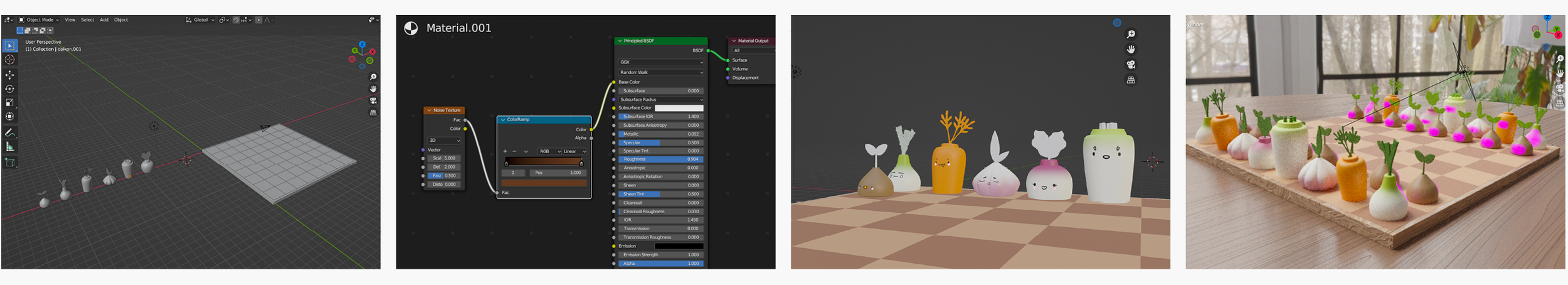 Used Blender for final render; Blender made it possible to customize gradients and have a felt-like coating for the leaves.