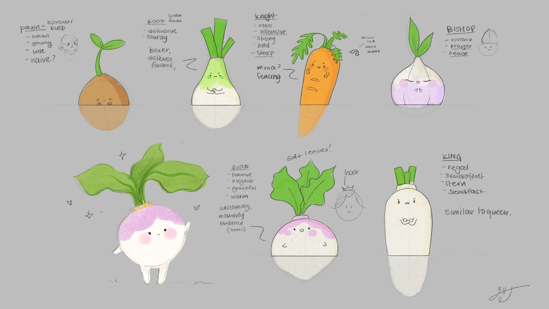 Focused on two concepts: Whales and Sharks, and Root Vegetables. Found idea of submerging pieces in the board interesting; fun to hint at something more beneath the surface.
