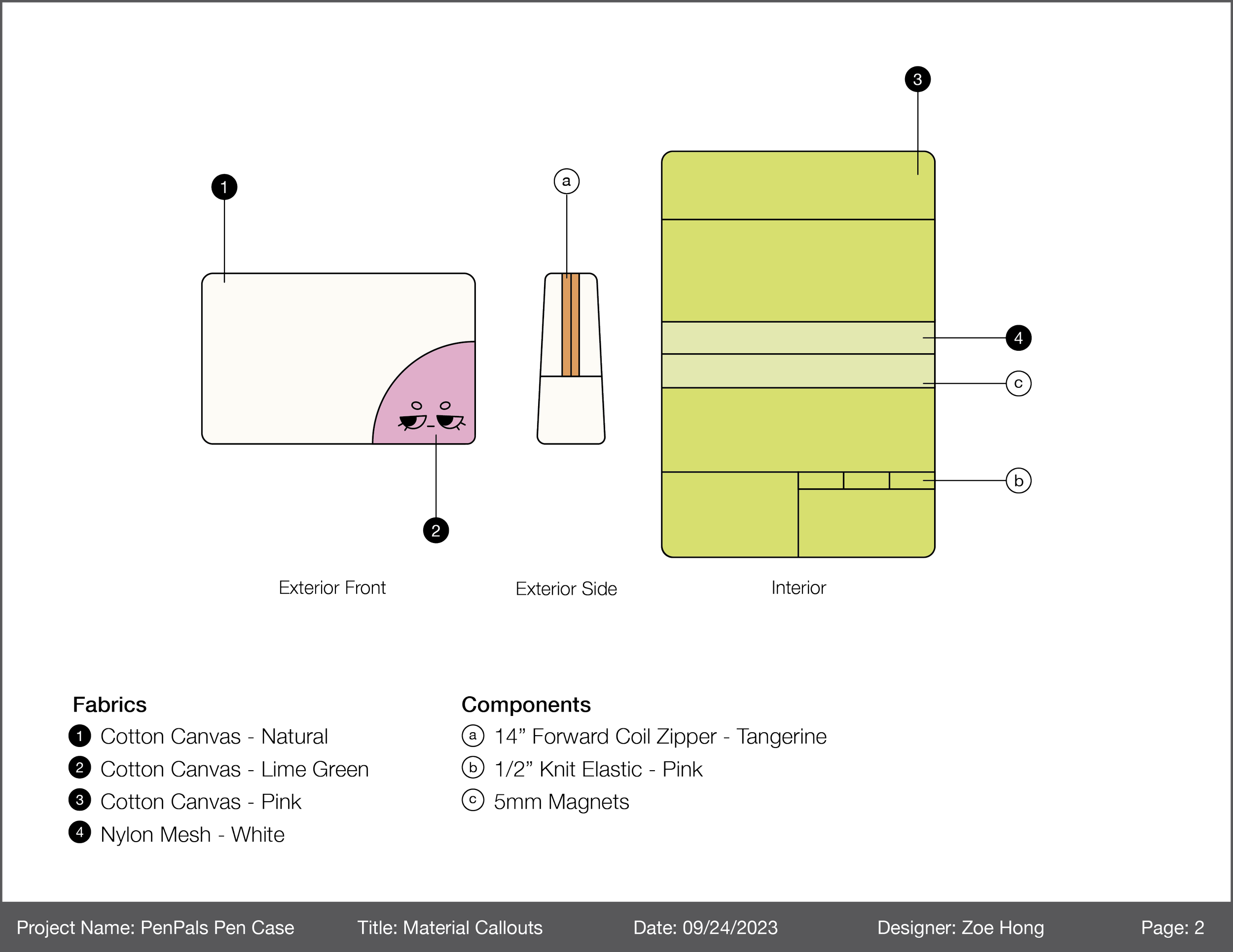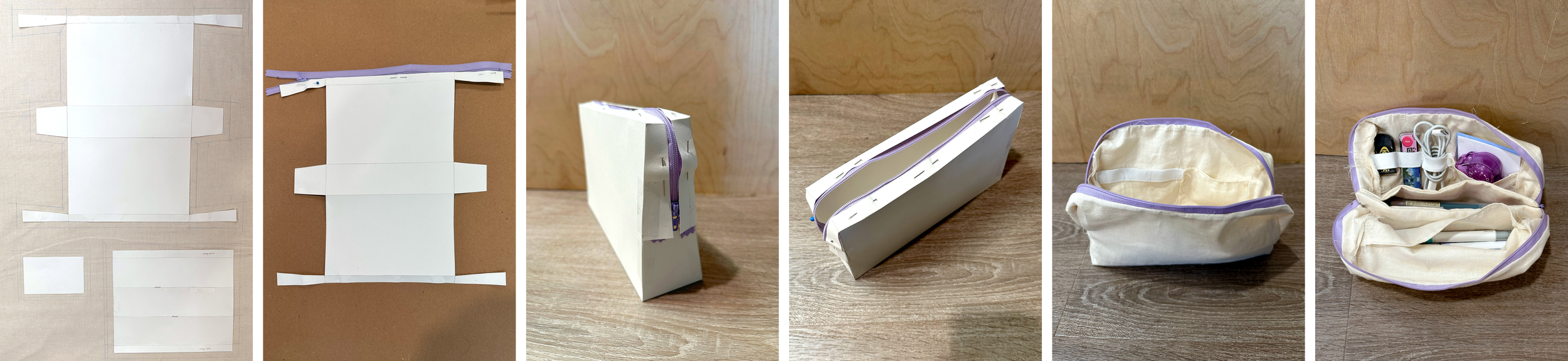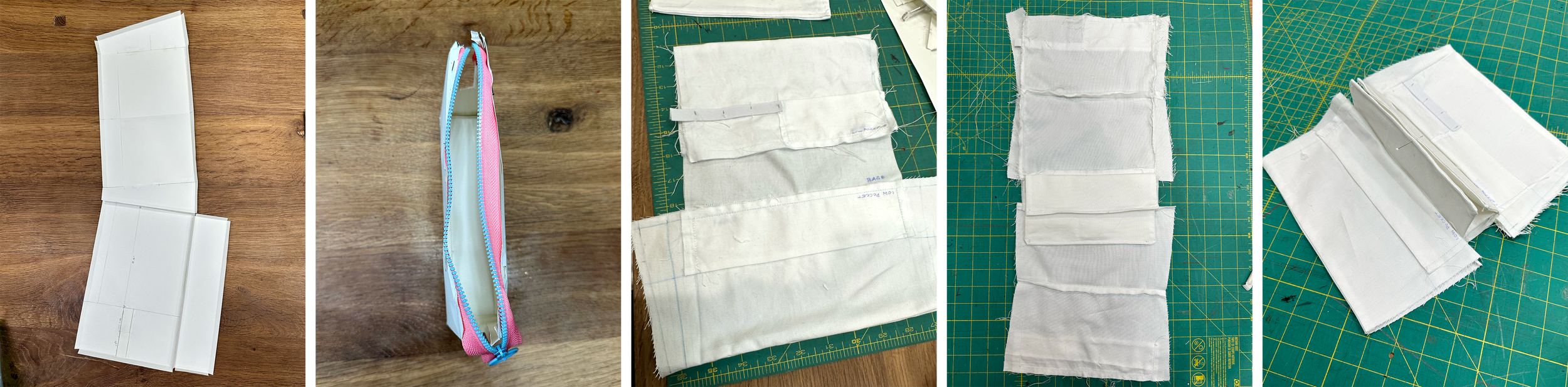 Updated paper pattern for zipper and reduced parts. Sewed prototype, then used pens for size validation.