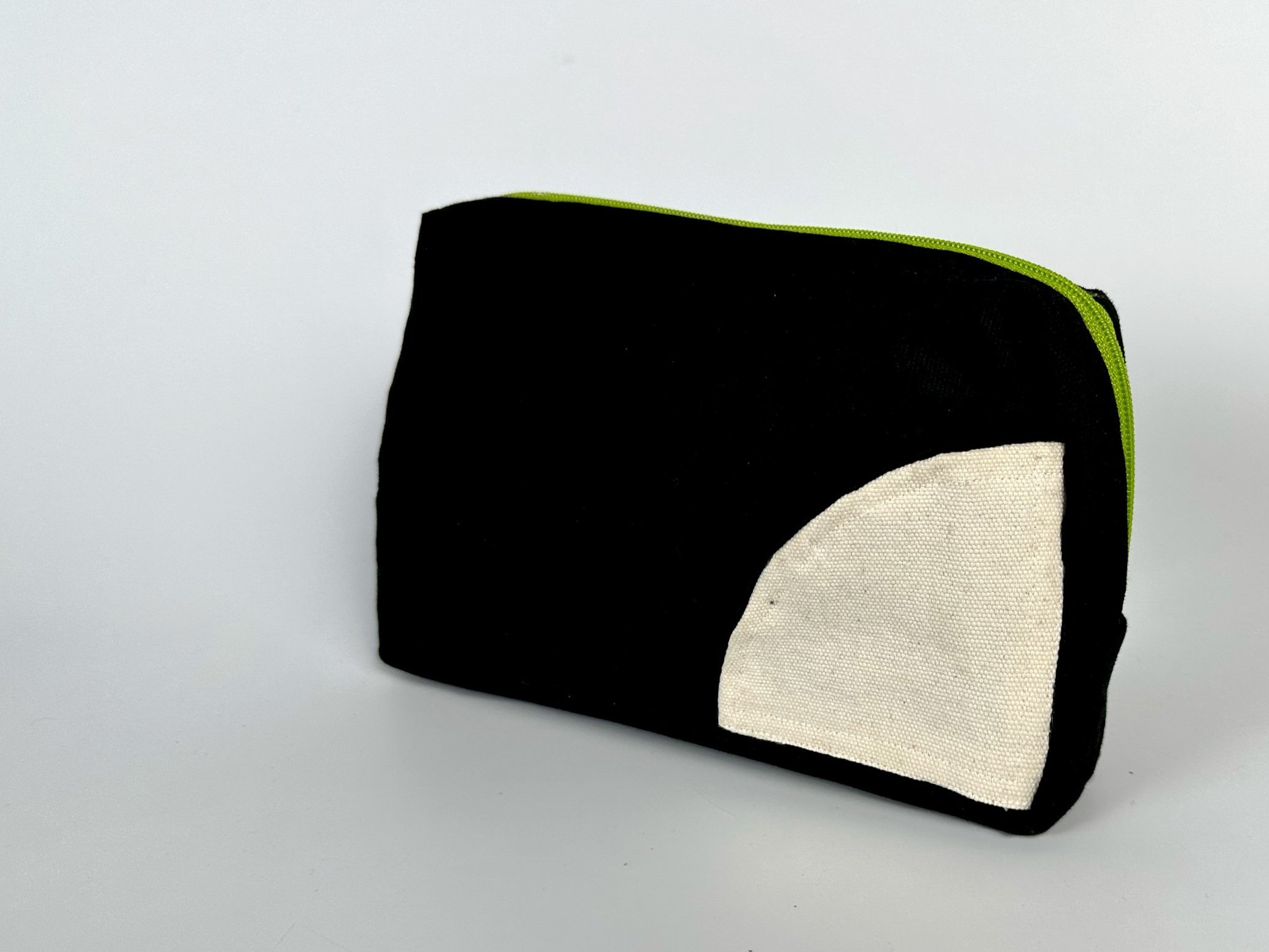 Cut pattern from canvas. Sewed pockets. Salvaged mesh from old pouch. Sewed zippers.